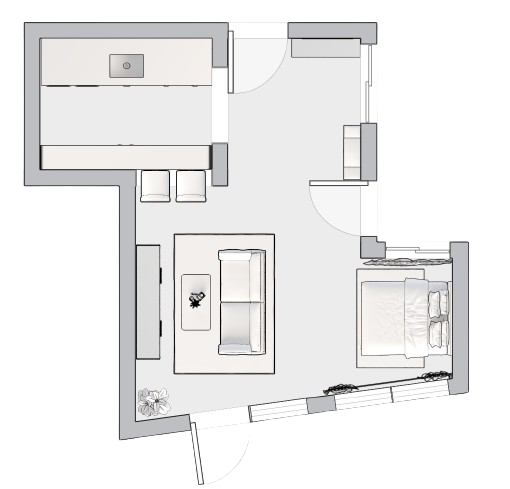 I began with the layout. The studio has a slant where the windows and balcony meet. We placed the bed in the alcove with a shelf above, under-bed storage drawers, a sconce for intimate lighting, and track curtains that can be shifted for privacy while also concealing the closet.